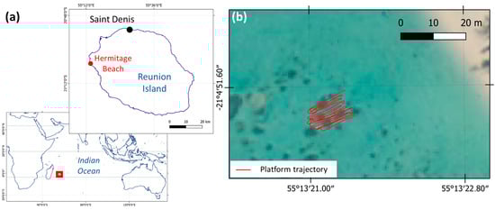 Field site at the Hermitage backreef zone in Réunion Island (France). (a) Map of Indian Ocean and Réunion Island. (b) Orthophotography of the field survey area (source: Bing Maps Aerial) and trajectory (about 250 m) of the POSEIDON system on 13 March 2023.