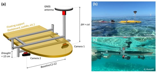 (a) Conceptual diagram of the POSEIDON system, with a structure adapted to a bodyboard holding two GoPro cameras and an RTK GNSS antenna vertically above one of the two GoPros. (b,c) Overwater (b) and underwater (c) views of the POSEIDON system during acquisition.