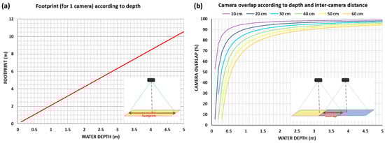 (a) Diagram of the theoretical footprint for one GoPro camera according to the water depth. (b) Diagram of the theoretical overlap between the footprints of the two GoPro cameras according to water depth and to the inter-camera distance.
