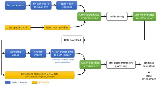At the end of the survey, all data were downloaded. A pre-processing step consisted of synchronization by assigning a UTC time to the frames extracted of the videos from the two cameras.