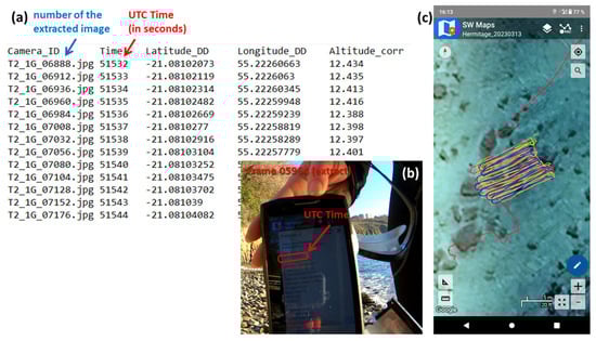 (a) Extract of a five-column file generated by a Python script, comprising the name of the extracted frames, the UTC time and the GNSS positions of the cameras (corrected of the ∆H offset). This file is then used as Reference file in Agisoft Metashape. (b) Image of the Smartphone filmed by one of the GoPro cameras to capture the GPS time on the SW Maps interface for GNSS–camera synchronisation. (c) Capture of the SW Maps interface for real-time GNSS–camera trajectory tracking (here, on the repeated surveys of the same area in the Hermitage backreef zone, on 13 March 2023).