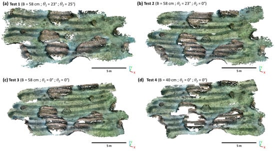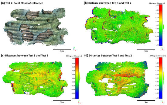 The Test 2 configuration is therefore the one that seems to give the best results in this context. A quantitative intercomparison was carried out, by calculating (in CloudCompare® software) the distance between the point clouds obtained for Tests 1, 3 and 4 and the cloud obtained for Test 2. The results of this intercomparison are presented in Figure 9 and Table 4.