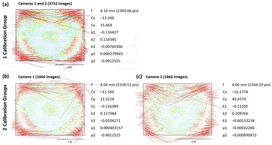 (a) Calibration report for a workflow where all the cameras are in the same calibration group, with diagram of the residuals of the tie points and estimated internal parameters. (b,c) Calibration report for a workflow where the cameras are divided into two calibration groups for Camera 1 (b) and Camera 2 (c).