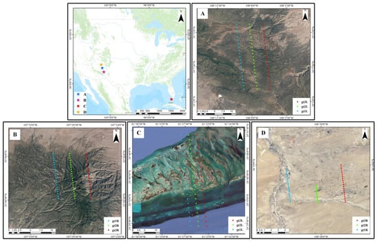 Figure 1 presents an overview of the experimental area for this paper. Four distinct sets of ICESat-2/ATL03 data are utilized in this study, which are shown in Table 1. Experimental Areas A and B are both located in the Cibola National Forest. Specifically, experimental area A is located in the central Sedgwick Mountains of New Mexico, while experimental area B is located in the northern San Mateo Mountains of New Mexico. Covered by forests, the density of ground photons in such areas are much denser than that of vegetation canopy photons. Experimental area C is located in close proximity to the Ramrod Island Reef in the Florida Keys. By utilizing water surface and bottom signal photons, topographical information of the shallow water bottom can be obtained. However, the signal photon density at the water surface is much denser than at the water bottom due to the gradual laser energy propagation inside the water. The conventional methods often fail to fully extract the signal photons from the water bottom, resulting in a lack of topographical information [,,]. Experimental area D is located near Sanostee, within the state of New Mexico. The land surface in this area is essentially devoid of feature cover and the signal photon composition is unitary in the data from this area, which are primarily utilized to test the denoising ability of different methods on simple data.