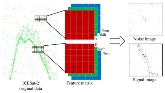 where is the ith photon in one grid of the 2D image; Count is the number statistics functions; is the elevation of each photon; is the elevation of the photon at the center of the grid ; L and H are the along-track distance and the elevation of the center of each cell; and and are the along-track distance and elevation of the grid center photon . These three feature matrices are first normalized separately and they are combined to construct a three-band image, then the transformation is completed.