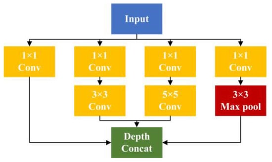 Therefore, the Inception module is proposed to enhance the training results by optimizing computational resource utilization and extracting more features with the same amount of computational workload. By incorporating convolutional kernels of varying sizes within a single layer, the Inception module expands the “width” of the network model and improves performance in capturing detailed original feature information across different scales, ultimately achieving more comprehensive feature representation. In the signal photon images, there are variations in shape and position features among different Earth surface scenes. The Inception module is capable of extracting the distinct features of the signal photon images, allowing the network to discriminate them from the noise photon images. The schematic of the Inception module is depicted in Figure 4: