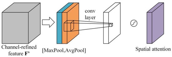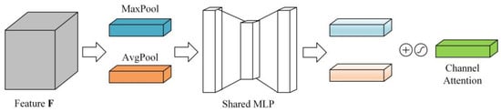 To enhance the ability of GoogLeNet to learn more effective features from the training sample images, the CBAM is further introduced into the network backbone. The CBAM, consisting of the Channel Attention Module (CAM) and the Spatial Attention Module (SAM), focuses on “attention” to improve the performance of the network by allowing the network to learn which information to emphasize or suppress, thereby facilitating effective information flow []. Figure 5 and Figure 6 show the specific structures of CAM and SAM, respectively. Specifically, the CAM identifies meaningful channels in input features, while SAM determines relevant features at spatial positions. The initial input features are sequentially passed through the CAM and SAM modules, during which the output features need to be multiplied pixel by pixel with the input features, resulting in the final CBAM-weighted features.