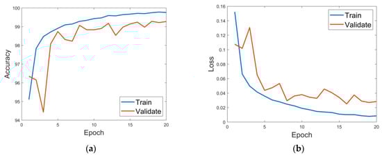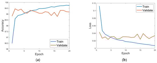 The training process of the network model in experimental area C. (a) Change curve of accuracy; (b) change curve of loss.