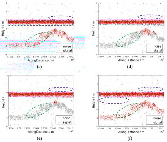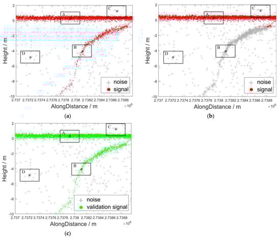 In order to validate the correctness of the signal photons obtained by the proposed method, a Digital Terrain Model (DTM) raster, Digital Elevation Model (DEM) raster, and bathymetric raster are used to validate. The DTM raster is obtained from the Goddard’s LiDAR, Hyperspectral and Thermal Imager (G-LiHT) dataset with a spatial resolution of 1 m (https://glihtdata.gsfc.nasa.gov/, accessed on 7 December 2023). The G-LiHT dataset [] was collected by the NASA science team using the G-LiHT system. G-LiHT is a portable airborne imaging system containing LIDAR, hyperspectral, and thermal imager sensors that simultaneously map the composition, structure, and function of terrestrial ecosystems. The bathymetric raster is obtained from the 2018–2019 NOAA NGS Topobathy Lidar DEM Hurricane Irma project [] which are collected by three Riegl systems and then used to create raster data with a spatial resolution of 1 m (https://coast.noaa.gov/htdata/raster2/elevation/NGS_FL_Topobathy_PostIrma_MiamiToMarquesas_2019_9060/, accessed on 7 December 2023). The DEM raster is obtained from The Terra Advanced Spaceborne Thermal Emission and Reflection Radiometer (ASTER) Global Digital Elevation Model (GDEM) Version 3 []. The geographic coverage of the ASTER GDEM extends from 83° north to 83° south. Studies to validate and characterize the ASTER GDEM confirm that accuracies for this global product are 20 m at a 95% confidence for vertical data and 30 m at a 95% confidence for horizontal data.
