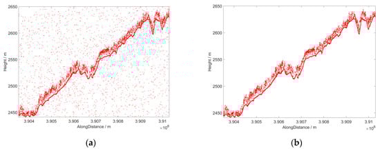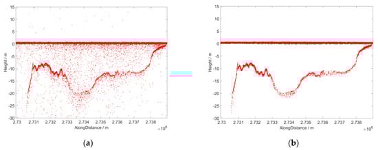The ATLAS system receives not only its own impulse signals but also noise caused by atmospheric scattering, solar radiation, and instrument artifacts. The initial collected photon data exhibits a significant amount of random noise that is distributed around the signal photons. Only after removing these random noises to get the clear signal photons can the data be utilized for various applications. As for the ICESat-2 photon data, the photon density within the neighborhood of a signal photon is significantly higher than that of a noise photon. Therefore, some conventional algorithms have been developed for noise photon removal, most of which are derived from the threshold segmentation algorithms based on local density or local distance. Among them, the most used one is Density-Based Spatial Clustering of Applications with Noise (DBSCAN) []. In order to include more signal photons in the search neighborhood, the circular neighborhood is commonly replaced by an elliptical neighborhood when the DBSCAN algorithm is applied [,,,,,]. Chen et al. [] proposed an adaptive variational ellipsoidal filtering bathymetry method which processes histogram statistics in the depth direction to separate surface photons from bottom ones, and adaptive variable ellipsoid filters allow the method to extract more signal photons at deeper regions. Leng et al. [] adopted a kernel density statistical approach to separate land and water, with the elliptical neighborhood flexibly rotated to accommodate more signal photons. This method can somewhat increase the local density gap between signal and noise photons. Nan et al. [] proposed a method that combines local denoising with global denoising to effectively eliminate outliers, which improves the denoising accuracy by means of secondary denoising. Yang et al. [] proposed backward elliptic distance (BED) to solve the signal photons fluctuate problem by rotating the elliptic domain, thus minimizing the points in the neighborhood. This method can obtain good results in mountainous areas. Zhang et al. [] proposed an algorithm which uses a genetic algorithm to find the optimal denoising thresholds. As opposed to using empirical thresholds, this method allows for adaptive selection of thresholds based on the real situation. Zhu et al. [] applied the Ordering Points to Identify the Clustering Structure (OPTICS) algorithm, which is similar to the DBSCAN algorithm, during processing procedure. But, compared with the DBSCAN algorithm, OPTICS is less sensitive to data parameters.