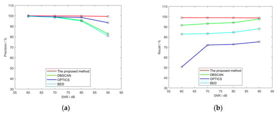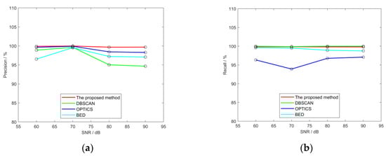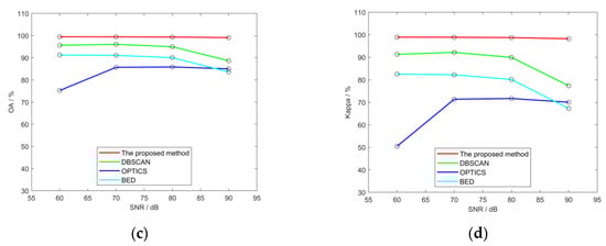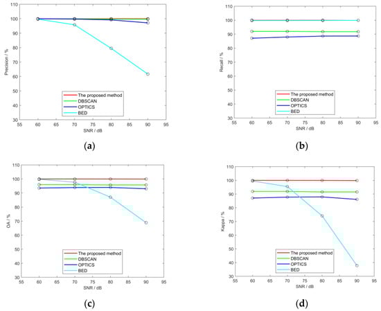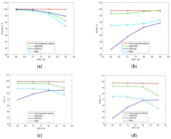 Curves of change in four validation indicators with SNR in experimental area B. (a) Precision; (b) Recall; (c) OA; (d) Kappa.