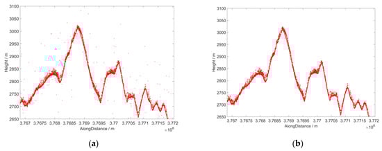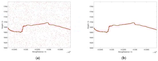The results of the comparison in experimental area A are presented in Figure 23 and Table 7. Experimental area A is a mountainous area with an elevation range of 340 m. As depicted in Figure 23, most of the photon elevations accurately reflect the reference elevation, while only a few individual photons exhibit significant deviations, resulting in an RMSE of 3.40 m and an R2 of 0.99. Table 7 presents the precision results of different denoising methods in each elevation interval. Lower MAE and MRE indicate that the signal photon elevations fit the real terrain elevations better and a lower RMSE indicates that the extracted signal photons contain fewer noise photons with large elevation errors. The proposed method achieves the best results in all three metrics compared to other conventional methods. These results also indicate that the signal photons extracted by the proposed method are more reliable.