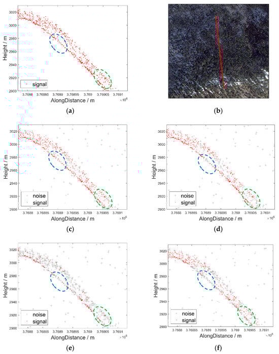 Comparison of the details of the results of the gt2R track in experimental area B (SNR = 70 dB). (a) Validation; (b) optical remote sensing image; (c) the proposed method; (d) DBSCAN; (e) OPTICS; (f) BED.