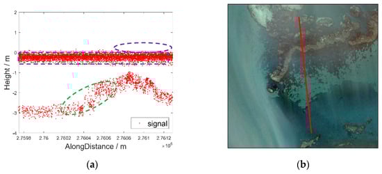 Schematic of real reference verification in experimental area A. (a) Scatterplot of elevation and actual elevation of gt2R track signal photons in experimental area A; (b) track distribution diagram in experimental area A.