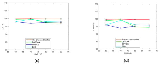 Curves of change in four validation indicators with SNR in experimental area D. (a) Precision; (b) Recall; (c) OA; (d) Kappa.