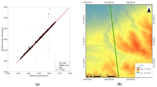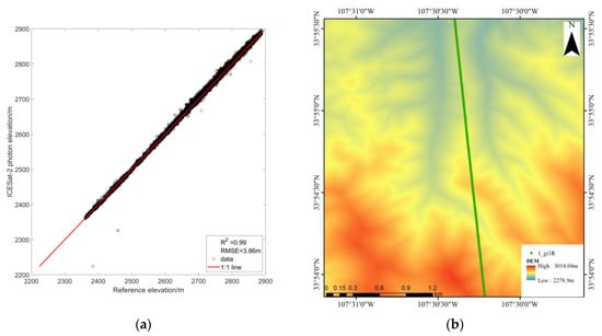 Schematic of real reference verification in experimental area B. (a) Scatterplot of elevation and actual elevation of gt1R track signal photons in the experimental area B; (b) track distribution diagram in the experimental area B.