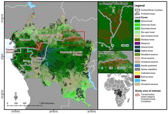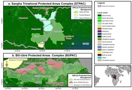 This study focuses on two transboundary protected area complexes: the Sangha Trinational Protected Areas Complex (STPAC) at the borders of Cameroon (CAM), Republic of Congo (COG) and Central African Republic (CAR) (Figure 4a), and the Bili-Uéré Protected Areas Complex (BUPAC) at the borders of the Democratic Republic of Congo (DRC) and Central African Republic (CAR) (Figure 4b).