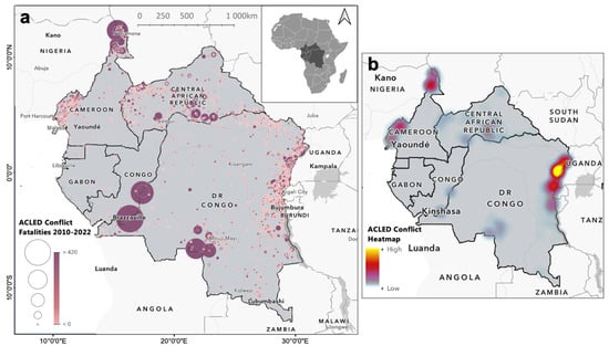 (a) Conflict fatalities in the Central Africa subregion aggregated for 2010–2022. (b) Heatmap of overall conflict incidents in the Central Africa subregion aggregated for 2010–2022. Source: Authors. Data: ACLED, accessed 2022 [].