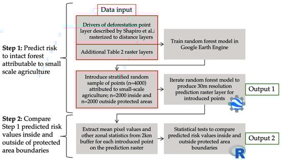 This study involved two major procedures: first, we predicted increased risk to intact forests from small-scale agriculture inside and outside of transboundary protected area complex boundaries with a stratified random sampling design within our study sites using a random forest model in Google Earth Engine. (This Google Earth Engine-based modeling work was conducted as part of a broader project implemented by the Food and Agriculture Organization of the United Nations (FAO) Forestry Division and Central African Forest Initiative (CAFI). The Earth Engine script was adapted from an algorithm originally developed as a land use planning support tool called Geoinformatics for Land Use Planning (Geo4LUP), a module for the System for Earth Observations, Data Access, Processing and Analysis for Land Monitoring (SEPAL), an open-source, cloud-based computing environment operated by FAO (https://sepal.io/ (accessed on 27 March 2022)). Second, we extracted zonal statistics from the prediction outputs and performed comparative statistical analyses in R (Version 4.3.2) to determine whether there were significant differences in the risk to intact forests inside and outside of the protected area boundaries. In this section, we first detail the study area, which included two Central African transboundary protected area complexes (Section 2.1), then the data used in this study (Section 2.2), and finally, the procedures used to predict the increased risk of deforestation and degradation resulting from small-scale agriculture. We then compared predicted risk inside and outside park boundaries (Section 2.3). Figure 3 presents a simple workflow outlining the major procedures taken for this study.