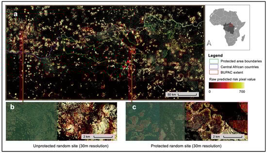After model selection, the random forest model was then trained on the identified incidents of deforestation and forest degradation, proximity to the small-scale agriculture drivers data points [] (Table 1, row 1), and additional biophysical, governance, and ecological data layers (Table 2). Predicted incidents of deforestation and forest degradation identified by the model were reclassified to probabilities to encapsulate risk [,]. After training the model on the image stack, a new set of small-scale agriculture points was introduced via stratified random sample (using ee.Image.stratifiedSample in Google Earth Engine with points generated on areas of intact forest) (total n = 4000) to predict the levels of increased risk associated with potential future small-scale agriculture. The stratified random sample of small-scale agriculture points included an equally sized random sample of sites inside and outside the park boundaries, accounting for the number of intact forest pixels. For both BUPAC and STPAC, n = 1000 intact forest points were sampled inside and outside the park boundary, resulting in n = 2000 points per complex and a total of n = 4000 points. The resulting predicted increased risk output was a raster layer at 30 m resolution, with one increased risk raster layer for each protected area complex.