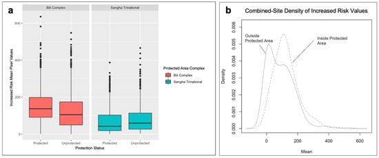 (a) Boxplots comparing mean risk values inside and outside the protected area complex boundaries. (b) Comparing distributions via kernel density estimation.