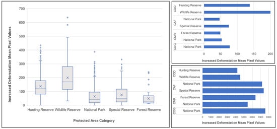 The results of this pilot study provide direction for future research. For example, causal inference and spatial econometrics techniques could be applied to address the role of spatial configuration of protected area categories in transboundary complexes and guide land use planning efforts. Future research could also explore alternative algorithmic approaches, such as neural nets, to determine if there is any change in the predicted risk to intact forests resulting from small-scale agriculture associated with an alternative modeling technique. Future research is also needed to clarify how and when designated protection categories within a broader complex do not align with realities on the ground. For example, our results indicated that the highest predicted increased risk to intact forests associated with small-scale agriculture in BUPAC was not Bili-Uéré Hunting Reserve but within Bomu Wildlife Reserve, which, according to Pélissier et al. [] and official protected area categorizations, should have a greater level of enforcement and resource-use restriction. However, as Ondoua Ondoua et al. [] describe, militia operations, poaching, and trafficking in the area may exceed the capacity of local enforcement. Similarly, in STPAC, the Nouabale-Ndoki National Park in COG presented higher predicted increased risk to intact forests than other less-strict categorizations within STPAC. These variations highlight the ways in which enforcement and prioritization dynamics can be influenced by transboundary contexts. As scholars such as Mason et al. [], Schoon [], and Petursson et al. [] have previously described, the varying national governance, institutional, political, economic, and social contexts, and indeed the varying degrees of conservation prioritization on each side of a border may also play critical roles in the level of protected area monitoring and effort. Furthermore, those factors can also play a role in the status of food security, socioeconomic conditions, and pressures to convert intact forests to other uses that can support livelihoods []. While this study highlights the need for future research to understand these transboundary dynamics, considering these factors, this study further builds a foundation for future research assessing within-country variations in predicted increased risk from small-scale agriculture and other drivers by national protected area categorization in Central Africa. For example, within-country analysis could also compare context-specific adaptations and innovations to the protected areas model, such as community-managed forests in DRC, and the procedures used in this study can be repeated for country-level disaggregation of protected area categories for DRC []. This also has important implications for reducing the risks and potential threats to biodiversity within protected areas such as BUPAC [].