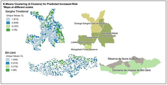 We also performed analyses to understand the spatial distributions of the predicted risk values considering protected area boundaries at both sites. K-means clustering was used to illustrate where spatial groupings of similar risk values were evident relative to protected area and international boundaries. K-means clustering is commonly used for partitioning data into distinct subsets, sorting n (number of points) into k (number of groups) by iteratively minimizing within-cluster sum of squared distances from each group’s centroid until a predetermined number of iterations is reached or the minimized distances no longer change significantly, resulting in each data point being sorted into one distinct group [,,]. Although k-means clustering and its visualization were useful in our study for understanding the spatial distribution of predicted risk relative to the protected area and international boundaries, the technique has well-known limitations and sensitivities, such as sensitivity to outliers and specification of k clusters [,]. We sought to address these limitations in arriving at a final visualization. For instance, because k-means clustering is sensitive to assigned starting points for iteration, we compared outputs from randomized initialization (iterations = 1000) and the commonly used k-means++ algorithm as described by Arthur and Vassilvitskii []. These resulted in similar outputs with k = 4 clusters (the ratios of the between-cluster to the total sum of squares at 0.612 and 0.611, respectively), and we ultimately presented the random initialization output in our Results section.