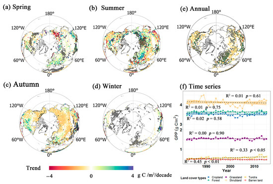 M–K trend of GPP values for each 0.25° × 0.25° grid for the four seasons (a–d) and annual mean (e) from 1982 to 2015. The “+” symbols in each sub-figure indicate statistically significant grids at the 0.05 level; (f) indicates the annual mean of the GPP value and the corresponding long-term trend for six vegetation types, with the shadows showing the 95% confidence interval.