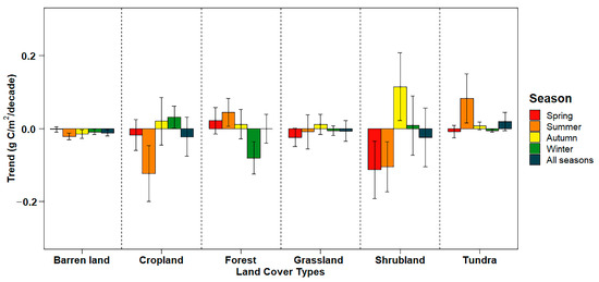The variations in GPP were shown to depend largely on latitude (Figure 1). Vegetation productivity in Arctic and pan-Arctic areas increased in spring and summer but decreased in autumn. The rate of variation at high latitudes was significantly higher in summer than in other seasons. GPP values also varied greatly among seasons and land cover types (Figure 2 and Figure S1). Specifically, the values decreased in spring for all land cover types except forests. Summer GPP values were significantly different among cropland, shrubland, and tundra, varying at rates of −0.12, −0.11, and +0.08 gC/m2/decade, respectively. Positive autumn GPP trend slopes were observed for all land cover types except barren land, while winter GPP trend slope markedly varied in cropland (+0.03 gC/m2/decade) and forest (−0.08 gC/m2/decade) areas. The growth of shrubland vegetation showed a large magnitude of trend compared to that of grassland and barren land vegetation, which decreased in spring and summer and increased in autumn and winter. The GPP values of forests increased in every season except winter. In contrast, the values of vegetation in barren land declined in every season.