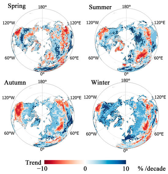 It is interesting that the frequency of trace precipitation in forest and shrubland increased while other land cover types decreased. In grassland, the frequency of all five precipitation categories decreased. In tundra areas, precipitation frequency varied slightly for the trace category at an average rate of −0.5%/decade. The rates of variation increased in summer and decreased in other seasons, with no obvious trend larger than 10 mm/day precipitation, which corresponds to the precipitation frequency data recorded for barren land.