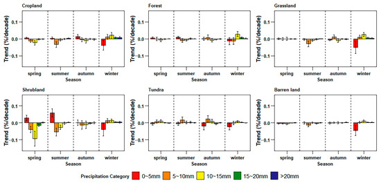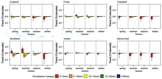 The frequency of seasonal precipitation varied in different land cover areas (Figure 4). In cropland, grassland, and barren land, this parameter showed a decrease in all precipitation intensity categories, with the largest decline detected in winter trace precipitation in shrubland (−2.3%/decade). In contrast, the frequency of trace precipitation in forests in summer and in shrubland in spring and summer increased at rates of 0.5%/decade, 0.8%/decade and 1.7%/decade, respectively. The frequency of trace precipitation in barren land declined at rates of −0.4%/decade, −1.1%/decade, −1%/decade, and −1.6%/decade in spring, summer, autumn, and winter, respectively.