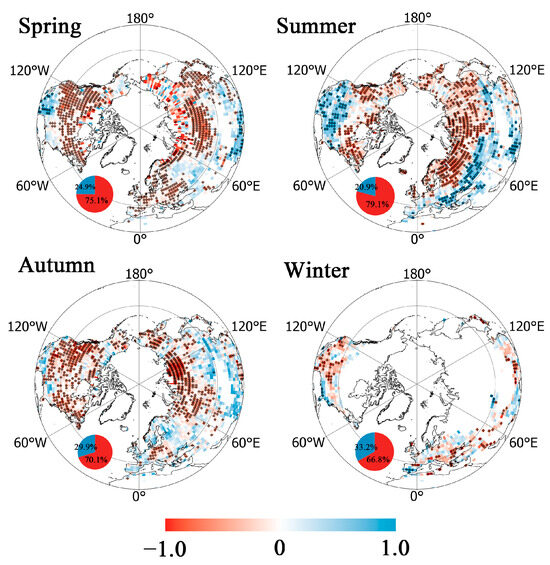 The correlation coefficient between GPP and the frequency of seasonal precipitation mainly indicated a significantly negative relationship in most study areas, especially at northern latitudes, but a positive relationship at mid-latitudes (Figure 5). The seasonal contrasts showed that the change magnitude and areas with significance was smaller in winter than in the other seasons.