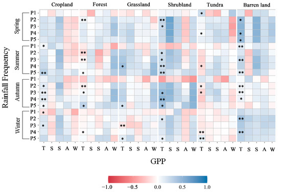 Pearson correlation coefficients between annual GPP values and precipitation frequency across seasons in every vegetation type. The letters T, S, S, A, and W in the horizontal ordinate stand for total year, spring, summer, autumn, and winter, respectively; P1–P5 indicate trace, small, moderate, heavy, and very heavy; * and ** in the T row indicate statistical significance at the 0.05 and 0.01 levels, respectively, obtained from the stepwise regression between precipitation frequency and GPP value from 1982 to 2015.