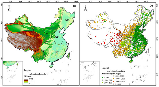 Mainland China is located in eastern Asia (between 73°33′ and 135°05′E and 3°51′ and 53°33′N). Mainland China’s topography is both intricate and diverse, characterized by a stepped distribution from west to east. The eastern regions feature a relatively flat terrain, whereas the western areas present more complex landscapes [36,37]. Rainfall is abundant along the southeast coast of China and gradually decreases as it moves inland to the northwest. Based on the previous literature [38,39], considering factors such as elevation, mountain ranges, and annual cumulative precipitation, this research divides mainland China into seven distinct sub-regions (Figure 1), including in-land Xinjiang (XJ), the Qinghai–Tibetan Plateau (TP), northwestern China (NW), northeastern China (NE), northern China (NC), southeastern China (SC), and the Yungui Plateau (YP). Meteorological observation stations are densely concentrated in the southeastern region, while they are sparser in the northwest [40]. These stations supply a substantial volume of measured precipitation data, which establishes favorable objective conditions for further validating the precision and dependability of the SPEs [18].