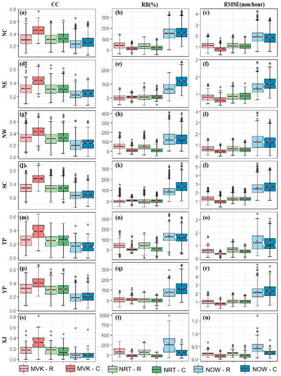 The boxplot for precipitation amount statistics for the CC (left column), RB (middle column), and RMSE (right column) in seven sub-regions on an hourly timescale: (a–c) NC (northern China); (d–f) NE (northeastern China); (g–i) NW (northwestern China); (j–l) SC (southeastern China); (m–o) TP (Qinghai–Tibetan Plateau); (p–r) YP (Yungui Plateau); (s–u) XJ (Xinjiang). The upper and lower edges of the box plot represent the first and third quartiles, the line inside the box represents the median, the dot represents the mean, and the black circles show mean anomalies.