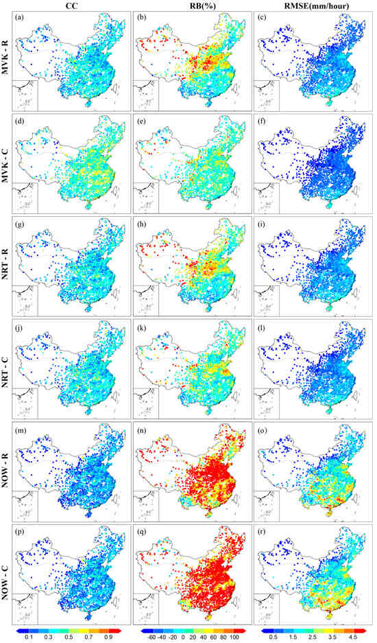 - The correction algorithm plays an important role in reducing errors and improving the ability to capture precipitation events. The corrected product performs significantly better than the uncorrected version, exhibiting higher CC values and lower RB and RMSE values in most sub-regions. Comparisons between the different versions show that the post-real-time version has the best correction. For example, MVK-C is corrected by CPC site data, showing a significant improvement in CC values in all sub-regions (hourly timescales greater than 0.3), and the proportion of sites with CC values greater than 0.5 increased from 0.03% (MVK-R) to 28.47% (MVK-C). However, the correction algorithms had a limited effect (about 0.01) on the near-real-time and real-time versions, probably due to the limited number of trajectory observations included in the corresponding correction procedures.