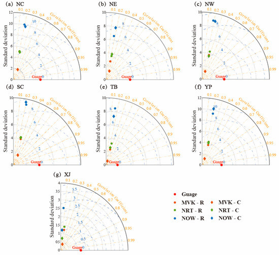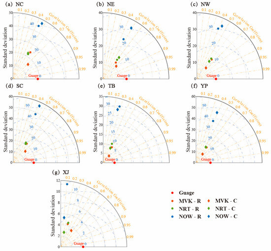 Taylor diagram showing the CC, STD, and RMSE of daily mean precipitation between the satellite-based precipitation products and the reference data for each sub-region (a) NC; (b) NE; (c) NW; (d) SC; (e) TB; (f) YP; and (g) XJ.