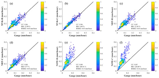 Scatter density plots of the rainfall rate in mainland China for six types of SPE: (a) MVK-R; (b) MVK-C; (c) NRT-R; (d) NRT-C; (e) NOW-R; (f) NOW-C.