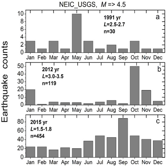 Histograms of the monthly number of earthquakes of M ≥ 4.5 occurring near the footprints of geomagnetic lines belonging to the newly created belts of relativistic electrons: (a) 1991, L = 2.5–2.7; (b) 2012, L = 3.0–3.5; and (c) 2015, L = 1.5–1.8.