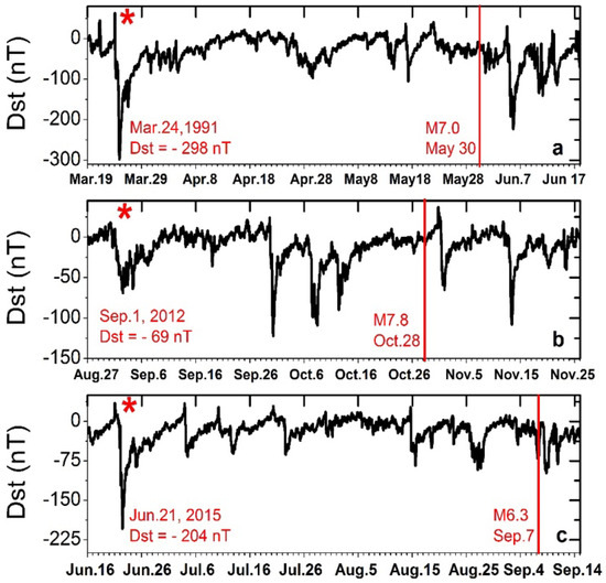 Variations of hourly mean Dst index for 3 92-day periods: (a) 1991, from 19 March, 04:30 UT; (b) 2012, from 27 August, 22:30 UT; and (c) 2015, from 16 June, 18:30 UT. Upper red star marks dates of geomagnetic storm onsets in March 1991, September 2012, and June 2015, and red vertical lines indicate the dates of the strongest earthquakes that occurred in the footprint of magnetic lines belonging to the radiation belts newly created in the inner magnetosphere due to indicated magnetic storms: M7.0 in Alaska on 30 May 1991, near the footprint of L~2.69; M7.8 near Canada on 28 October 2012, near the footprint of L~3.3; and M6.3 in New Zealand on 7 September 2015, near the footprint of L~1.58.