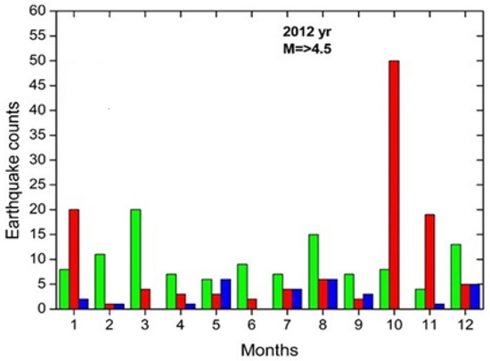 To test whether the relationship of seismic activity with the magnetic storm was significant in the spatial domain (near the footprints of magnetic lines belonging to a new radiation belt created due to the storm), we present Figure 4. It shows the distribution by month in 2012 for the number of earthquakes of M ≥ 4.5 that occurred near the footprint of L = 3.0–3.5 (red bars), as well as in neighboring geomagnetic lines L = 2.5–2.99 (green) and L = 3.51–5.0 (blue).