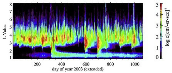The deepest, most recent high-energy electron radiation belt (around L~1.5) was detected after a giant magnetic storm at the end of October (beginning of November 2003 (Halloween storm), when the Dst-index reached up to –400 nT [37]. At this time, the Solar Anomalous and Magnetospheric Particle Explorer (SAMPEX) detected multi-MeV electron transport from the outer zone of the radiation belt through the slot region into the inner magnetosphere up to L~1.5 [39,40]. Figure 5 shows the distribution of the flux intensity of relativistic electrons with energies of 2–6 MeV, according to the SAMPEX satellite data from [40] (fragment of their Figure 1).