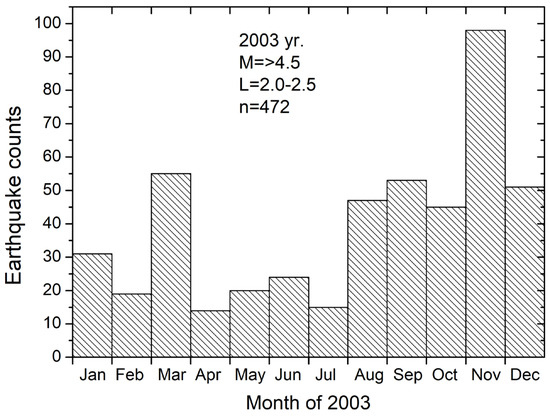 It is seen from Figure 5 that the precipitation of high energy electrons from the outer radiation belt (which has a maximum around L~4.0) started on 31 October (304 days from the beginning of the year 2003) and lasted for about 30 days (during the entirety of November 2003). In this time interval, the relativistic electrons strongly filled the geomagnetic field lines L~2.0–2.5, as shown in Figure 5. Usually, this range of field lines is purely filled by charged particles, provided it belongs to a slot region (L~2.0–3.0, Figure 1). In analogy with the previous cases, which were presented in Figure 2, one may expect an increase in seismic activity in the regions located near the footprint of magnetic lines L~2.0–2.5 some weeks after the onset of the magnetic storm on 31 October 2023, and this does indeed occur. Hence, Figure 6 presents monthly earthquakes of magnitude M ≥ 4.5 that occurred in January–December of 2003 near the footprints of L = 2.0–2.5. It is seen that for the base of L = 2.0–2.5, the number of earthquakes strongly increased in November 2003; the largest here was an earthquake with M = 7.8, which occurred at the Rat Islands, Aleutian Islands, Alaska, on 17 November 2003, with coordinates 51.146°N, 178.650°E near the footprint of L~2.1. This earthquake happened ~17 days (over 2 weeks) after the geomagnetic storm onset on 31 October 2003.