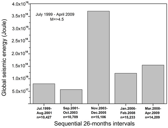 The SAMPEX instruments detected a newly formed belt of relativistic electrons in the inner magnetosphere around L~1.5 for ~26 months (from November 2003 to December 2005 [39,40]). It is reasonable to compare the amount of global seismic energy released before and after this 26-month interval. To do this, we used the USGS Seismological Catalog for representative magnitudes M ≥ 4.5 (https://earthquake.usgs.gov/earthquakes/search, accessed on 25 October 2018) from July 1999 to April 2010 (65,684 earthquakes). For each of the events, the released seismic energy was estimated using the Gutenberg and Richter relation [47] (Es = 10(11.8+1.5M), where M is the magnitude, and the Es value is in ergs. Then, the sum of Es in each of the five 26-month intervals was estimated. The intervals were July 1999–August 2001 (10,427 events), September 2001–October 2003 (10,709 events), November 2003–December 2005 (15,106 events), January 2006–February 2008 (15,233 events), and March 2008–April 2010 (14,209 events). In Figure 7, the released seismic energy is given in Joules. It is seen in the 26-months bin (November 2003–December 2005) (when a belt of relativistic electrons was present in the inner magnetosphere due to the giant storm of 31 October 2003) that the released seismic energy peaked strongly (~3.7 × 1018 Joule) according to results in the 26-month intervals before and after. According to statistics, one earthquake with a magnitude of M8 or more occurs annually. However, when an intense belt of relativistic electrons existed in the lower magnetosphere in November 2003–December 2005 (after a giant magnetic storm in late October 2003), three such events occurred around the globe relatively rapidly (slightly more than 3 months). These were M8.1 (north of Macquarie Island on 23 December 2004), M9.1 (Sumatra, the Andaman Islands on 26 December 2004), and M8.6 (northern Sumatra on 28 March 2005).
