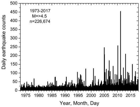 Figure 9 presents the daily counts of earthquakes with a magnitude of M ≥ 4.5 that occurred on the Earth from 1 January 1973 to 31 December 2017, estimated based on the USGS Global Seismological Catalog. Over 226,000 earthquakes with a magnitude of M ≥ 4.5 occurred during these years.