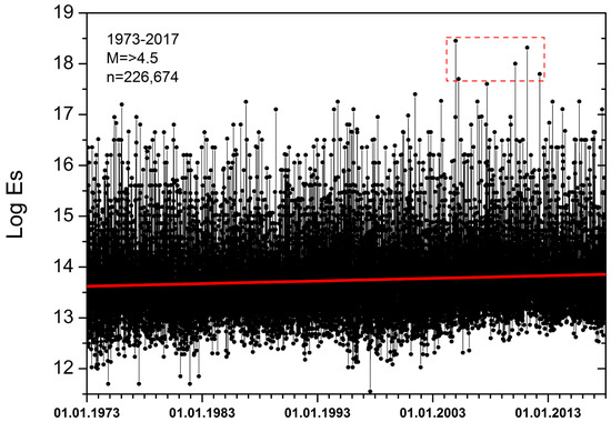 Figure 9 shows that the number of seismic events around the globe has shown a sharp increase since the beginning of the 21st century. To underline that this is not a result of increasing global seismic network, which could register more effectively low magnitude earthquakes, we present in Figure 10 daily values of the released at the Earth seismic energy (log Es = 11.8 + 1.5 M) for the same period, from 1 January 1973 to 31 December 2017. The thick red line is a linear trend, which shows a monotonic, slightly increasing seismic energy from 1973 to 2017; the dashed square marks the cluster of the five strongest earthquakes (magnitudes more than 8.5) that occurred on the globe at the beginning of the 21st century: M9.1 (Sumatra, the Andaman Islands on 26 December 2004), M8.6 (northern Sumatra on 28 March 2005), M 8.8 (Chile on 27 February 2010), M 9.0 (Great Tohoku Earthquake, Japan on 11 March 2011), and M 8.6 (northern Sumatra on 11 April 2012).