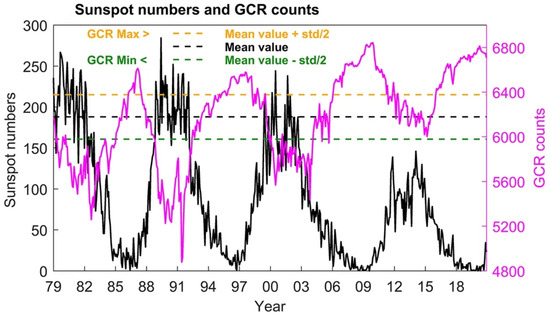 Because of the hypothesis that seismic activity increases with increasing galactic cosmic ray (GCR) flux—which increases conductivity in the lower stratosphere and upper troposphere and thus increases the effectivity of the global electric circuit functioning, of which one element is an earthquake [8]—we show in Figure 11 the monthly time variation of galactic cosmic ray count (pink curve) and sunspot number (black curve) for the period 1979–2020, as obtained from [54]. Figure 11 shows out-of-phase variations in galactic cosmic rays and sunspot numbers. The black dashed line in Figure 11 is the time mean value of GCR counts. In contrast, the gold and green dashed lines indicate the one-half standard deviation above and below the mean, defining the maximum and minimum GCR groups, respectively. It can be seen that during the two decades of the 21st century, the intensity of GCR increased compared to previous decades. This supports the suggestion that the functioning of the GEC may have been more effective at the beginning of the 21st century, which could be responsible for a monotonic increase in global seismic activity from 1973 to 2017 (red trend in Figure 10).