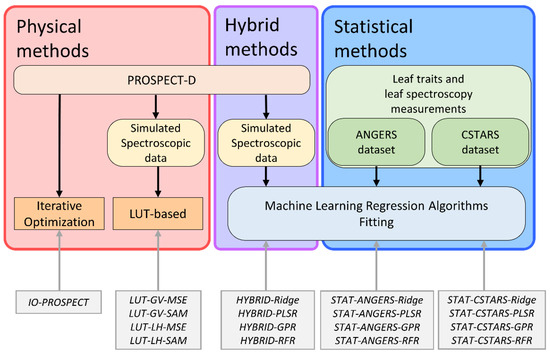 In situ and laboratory measurements provide the most accurate estimations of leaf traits. However, considering the high costs and time consumption of laboratory analysis and the spatial limitations of field leaf sampling, estimating these traits using these techniques over large ecosystems is unrealistic. An alternative that has been increasingly and broadly used is leaf spectroscopy with the measurement of leaf optical properties (LOPs: leaf reflectance and transmittance) from VSWIR spectroradiometers [20]. In general, these estimation methods can be classified into three main categories: statistical methods, physical methods, and hybrid methods [21]. The first category uses a training dataset composed of concurrent leaf traits and LOP measurements to build regression models with a machine learning regression algorithm (MLRA). Applying the trained regression model upon LOP enables estimating the associated leaf trait values. Physical methods rely on LOP measurements and LOP simulations from radiative transfer models (RTMs) which relate leaf traits to LOP with a mechanistic description of the physical scattering processes that drives interactions between light and leaf constituents. Then, an inversion method is performed to estimate leaf traits by finding the best fit between the measured and simulated LOP among strategies including iterative optimization based on minimization algorithms [22] or look-up table (LUT) building [23]. The last category, called hybrid methods, combines aspects of both statistical and physical strategies. Hybrid methods build an inverse model with an MLRA trained on a synthetic dataset constituted by LOP simulations generated with an RTM [24]. On the one hand, physical and hybrid methods are RTM-based methods, i.e., they depend on the ability of the RTM to accurately simulate the physical processes by which LOPs are derived from leaf traits. On the other hand, statistical methods mainly depend on the properties of the training dataset and the MLRA fitting protocol.