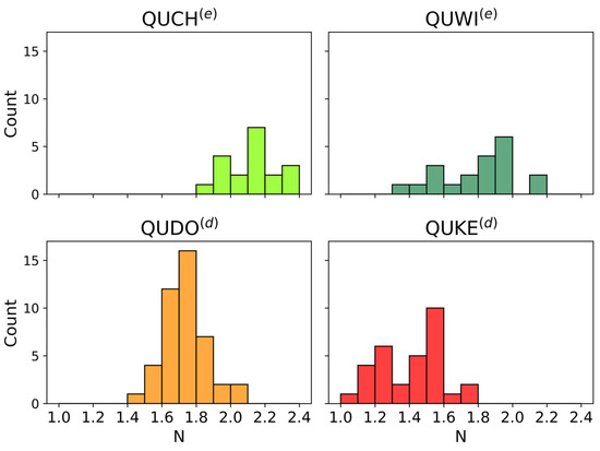 Four endemic Californian oak species were selected for our study, namely blue oak (Quercus douglasii), interior live oak (Quercus wislizeni), black oak (Quercus kelloggii), and canyon live oak (Quercus chrysolepis) [3]. More information, including their spatial distribution, leaf characteristics, and their respective acronyms (QUWI(e), QUKE(d), QUCH(e), QUDO(d)) that will be used throughout this article, is given in Figure 1, and on the websites of the California Native Plant Society (https://calscape.org; accessed on 18 September 2023) and UC Jepson eFlora (https://ucjeps.berkeley.edu/eflora; accessed on 18 September 2023). Superscript (d) (respectively (e)) in the species acronyms denote if the species is deciduous (respectively evergreen). QUDO(d), commonly called blue oak, is a broadleaf deciduous tree up to 18 m tall that is generally found in a ring bordering the Central Valley, in the lower reaches of the Sierra Nevada foothills, the San Francisco Bay Area, and both the Northern and Southern Coast Range, at between 150 m and 600 m elevation. QUDO(d) is distributed on dry and well-drained slopes, prefers full sun exposure, and is drought-tolerant. Its dull blue-green deciduous leaves are oblong (length from 3 to 8 cm), with wavy or slightly lobed margins, and are pubescent below. QUWI(e), commonly called interior live oak, is a broadleaf evergreen tree, up to 22 m tall, present in foothills and hot/dry canyons, being most abundant in the lower elevations of the Sierra Nevada but also widespread in the Pacific Coast Ranges at an elevation from sea level to 1500 m. Its evergreen alternate leaves are thick, leathery, small (2–5 cm), flat, generally elliptical, but shiny, lighter green below, and may have either toothed or smooth margins. QUCH(e), called canyon live oak, grows up to 30 m tall and is the most widely distributed oak in California. QUCH(e) is a broadleaf evergreen species and occurs in mountainous regions at an elevation from 30 m to 2800 m, growing close to creeks and drainage swales, in moist cool microhabitats (Sierra Nevada, Coast Ranges, etc.). Its leaves are flat, elliptical to oblong extending to an acute leaf tip (length from 2.5 to 8 cm), green dark and glossy above with spines, dull golden and hairy below. QUKE(d), commonly known as the California black oak, is a broadleaf deciduous tree growing up to 35 m in height. It is found in pure or mixed stands, growing in a wide range of mixed evergreen forests, oak woodlands, and coniferous forests distributed from the foothills and lower mountains of California to elevations between 30 m and 2600 m. Its wide deciduous leaves are deeply lobed (length from 10 to 20 cm) with acute tips, dark and shiny green on top and pale and noticeably fuzzy underneath.