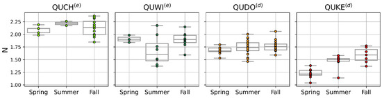 The dataset contains a total of 114 leaf samples collected during 5 field campaigns in 2013 and 2014 over 3 seasons (i.e., spring, summer and fall) (Table 1). The number of sampled trees per site and per season is given in Table 2. QUDO(d) is the species with the highest number of samples, with 44 trees, followed by QUKE(d) with 31 trees. QUCH(e) and QUWI(e) are only present on one site and therefore fewer trees were sampled (circa 20 trees).